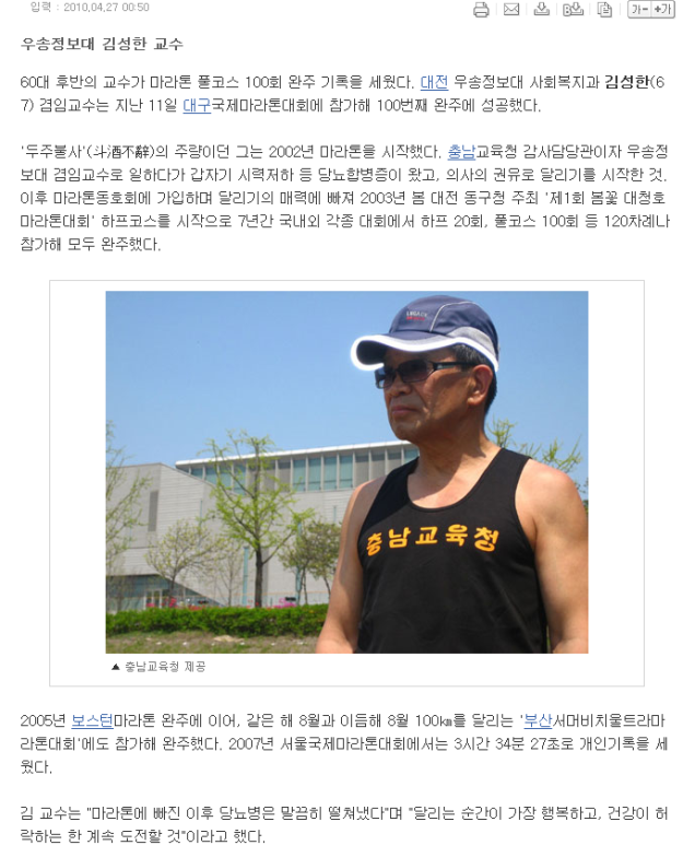 커뮤니티 구인/구직 공지사항 자유게시판 자료실 포토갤러리 동영상 관련사이트 Home커뮤니티포토갤러리 포토갤러리 67세에 마라톤 100회… \\\"도전은 계속\\\" (김성한 교수님★) 카테고리 : | 작성자 : 야간조교 | 작성일 : 2010.04.30 | 조회수 : 7,125 마라톤 100회 완주 김성한교수님~★★★ 출처- http://news.chosun.com/site/data/html_dir/2010/04/27/2010042700070.ht ml 첨부파일 1273121822_김성한교수님..bmp 목록 이전글 연광복지재단 자원봉사 다음글 이채식교수님4(봉사활동)